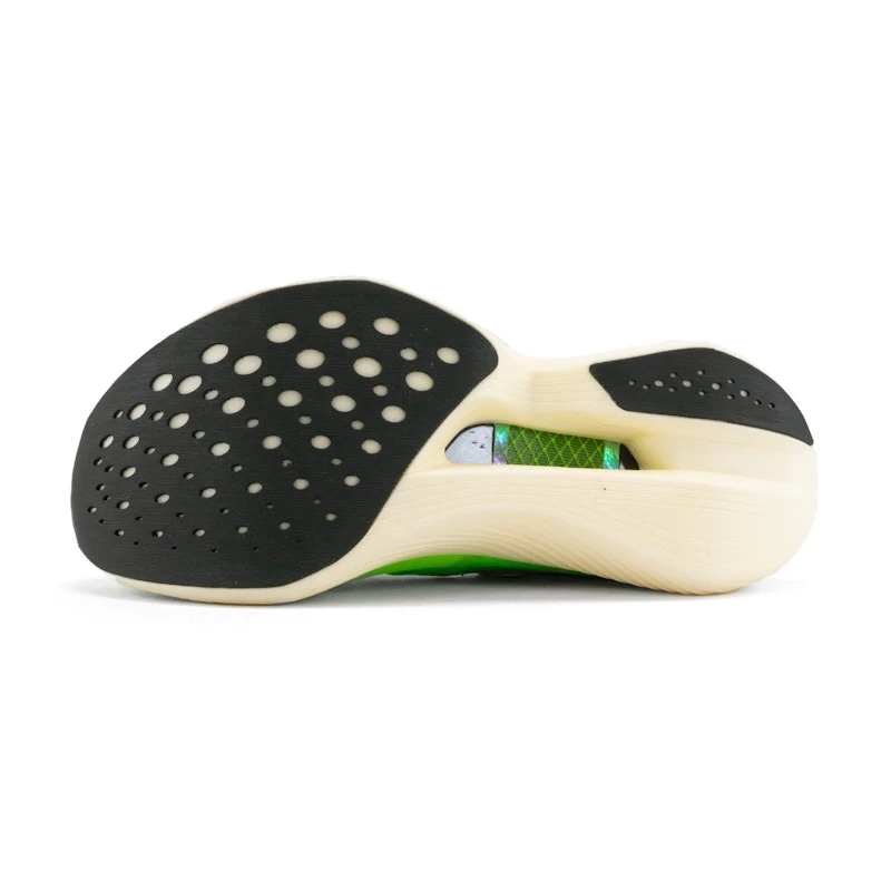 La tige est composée d’un mélange de maille et de tricot. Elle est respirante, légère et enveloppe vos pieds confortablement telle une chaussette. Autour du medio-pied se trouve une bande solide qui s’étend jusque sous la plaque de carbone. Cela assure un bon maintien afin que vos pieds ne glissent pas. Le contrefort de talon est très flexible et la languette a de nombreux trous de ventilation pour garder vos pieds frais et au sec.